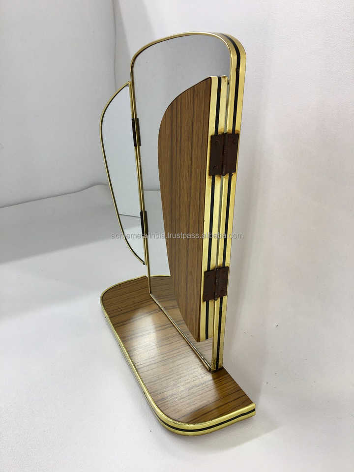 Three Fold Vanity Mirror in Brass Frame with Gold Plated Borders and Wooden Back Perfect for Shaving and Makeup Table Decor