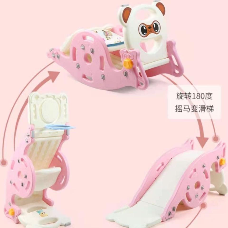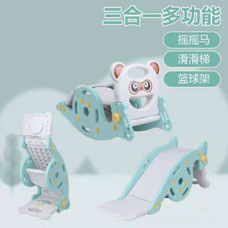 Three In One Kids Rocking Horse Slide Basketball Rack Plastic Cartoon Design For 1-6 Years Old Children Unisex Play Structure