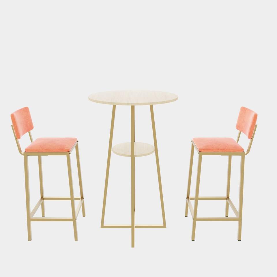 Three-Piece Bar Table Chair Set with Storage Function Gold Frame and Beige Orange Sponge Seat Cushions and Backrests