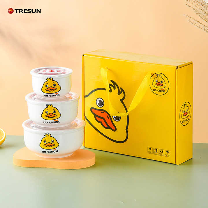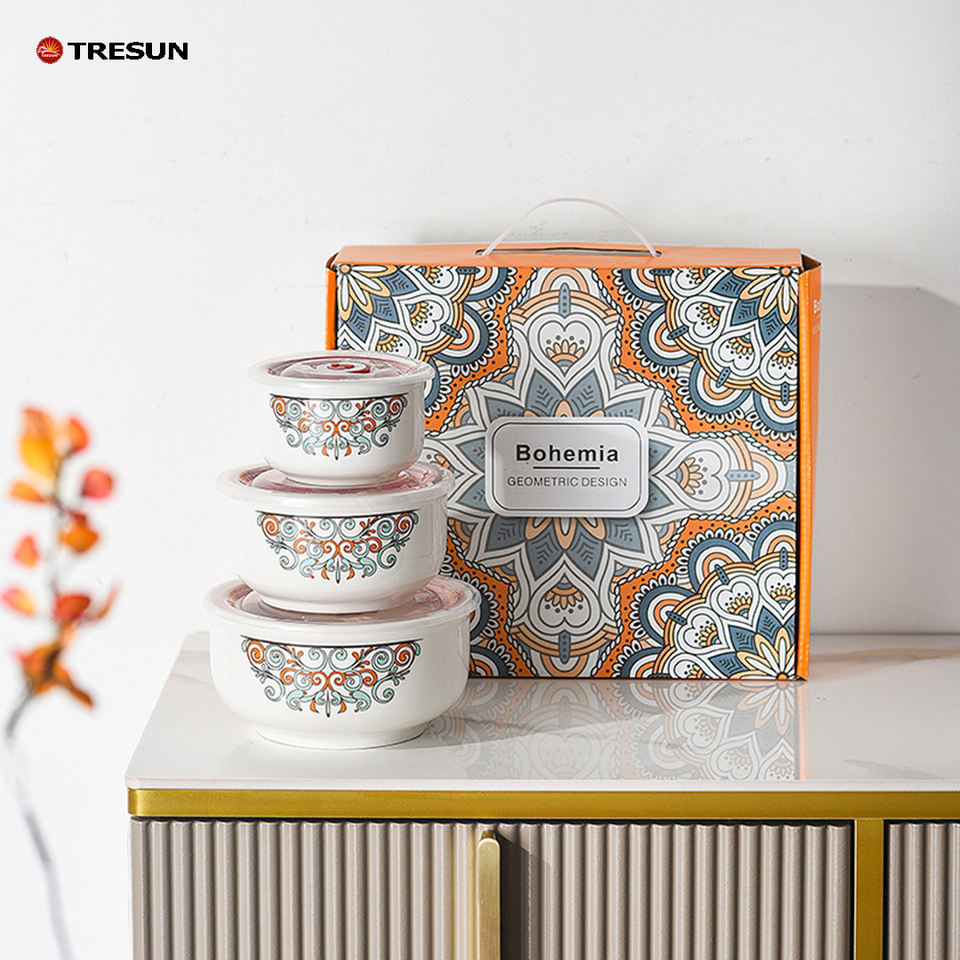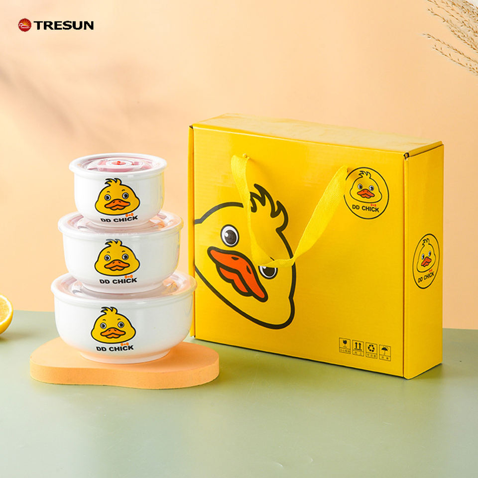Three-Piece Gift Box Gift Set Hot Selling Flower Ceramic Rice Bowl Freshness Bowl Shop Gift Customized Fresh-keeping Bowl Set