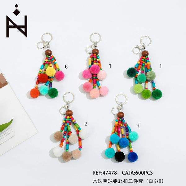 Three-Piece Set of White K-Buckle LLAVERO Wood Bead Wool Ball Keychains