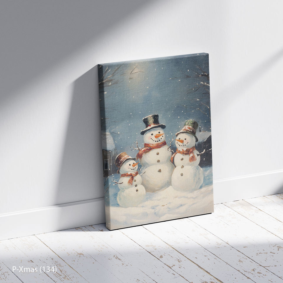 Three Snowmen in a Blue Winter Night HD Modern Canvas Art with Wood Frame Wholesale