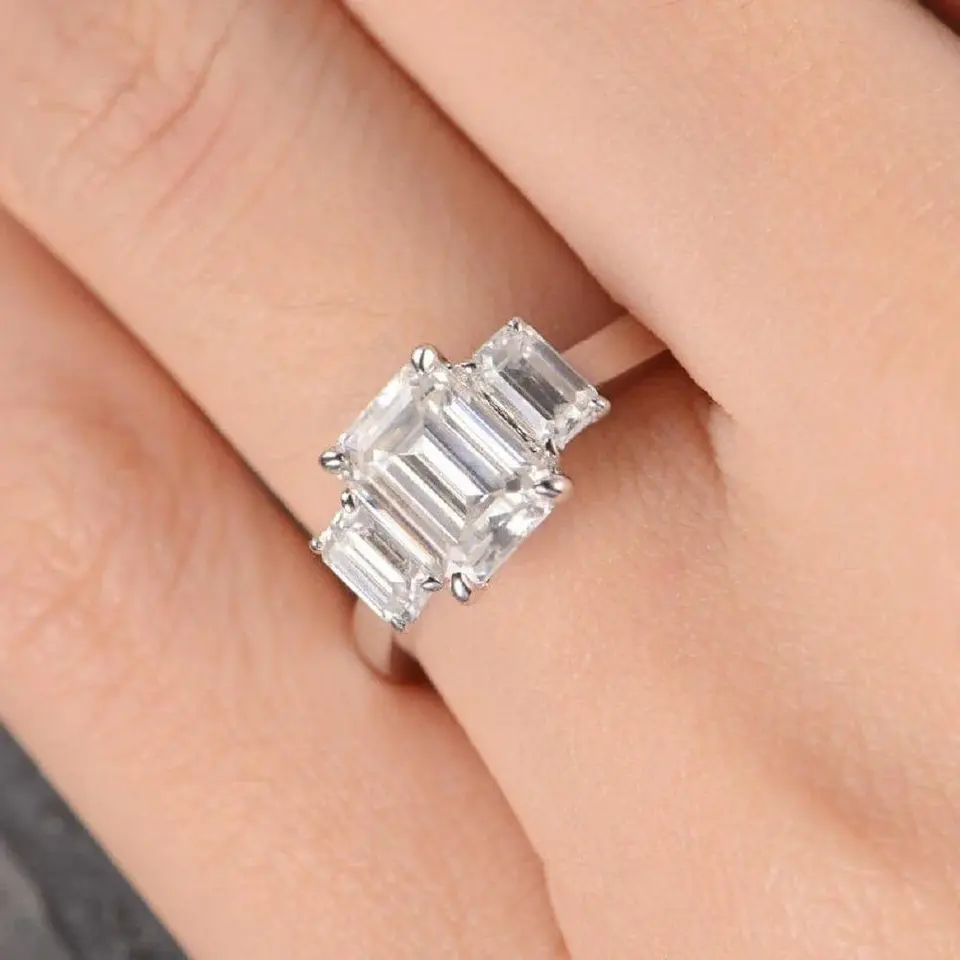 Three Stone Emerald CutPremium Engagement Ring for Women Round Cut Moissanite 925 Sterling Silver White Gold Plated Fine Jewelry