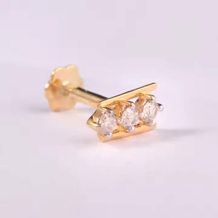 Three Stone Natural Round Diamond Nose Stud Pin Vertical Bar Nose Pin Piercing Jewelry in Solid 14k White Yellow Rose Gold