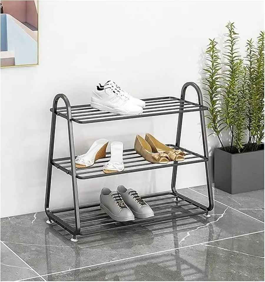 Three Tier Shoe Rack Storage Organizer Wood and Metal Mesh Shelf Modern Space Saving Shoe Stand for Entryway Bedroom Living Room