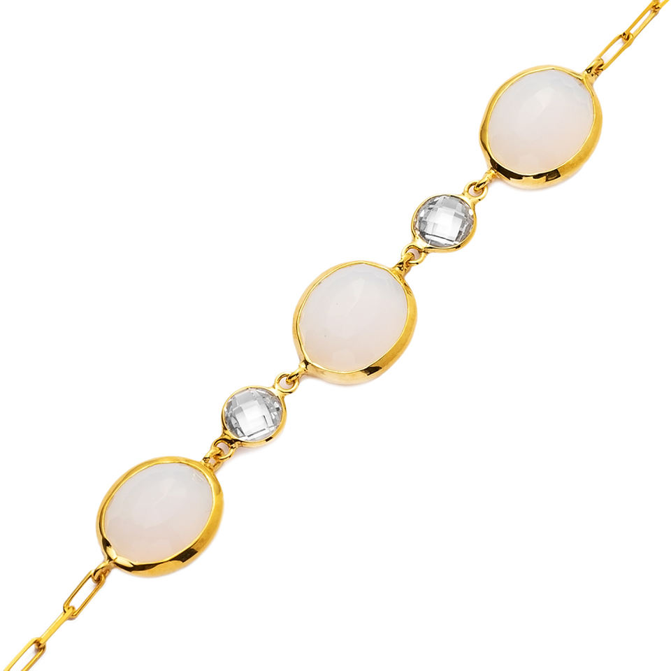 Three White Quartz and CZ Stone 22K Gold Bezel Silver Bracelet Wholesale Handmade 925 Sterling Silver Jewellery
