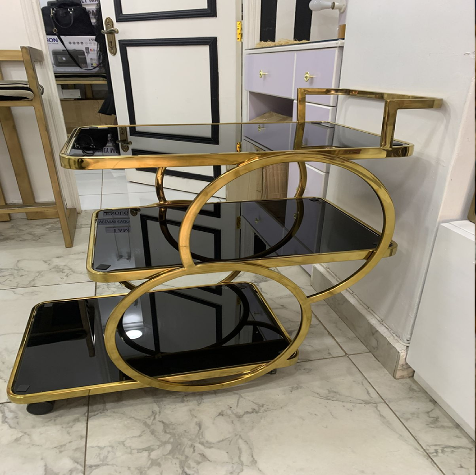 Three-tier oval bar cart, sleek gold frame with black glass shelves. Modern design. Available at wholesale price.