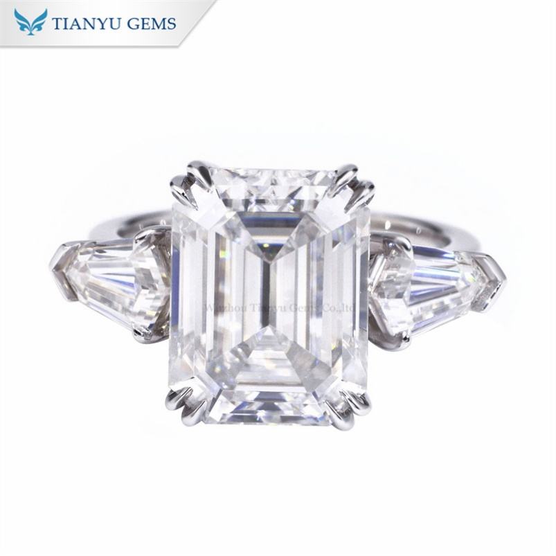 Tianyu Gems Unisex Three Stone Ring Double Claw Design with Emerald Kite Shape Moissanite for Wedding Engagement Party Gift
