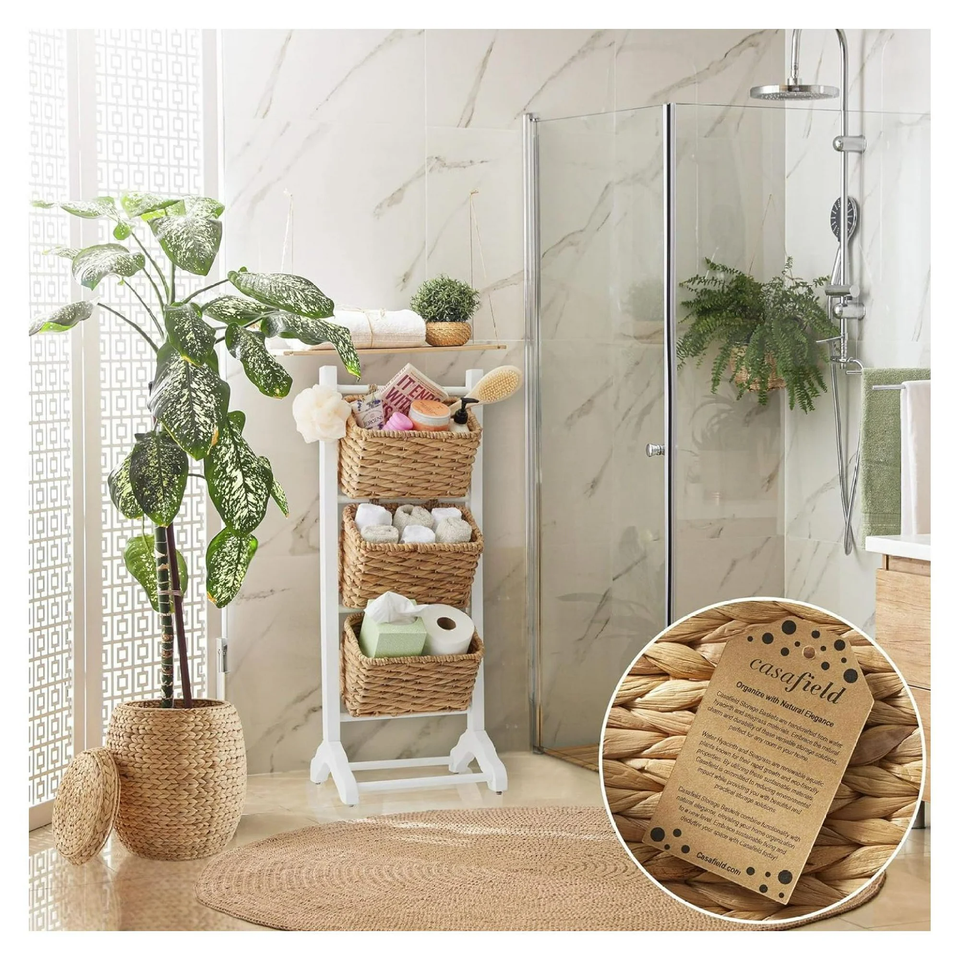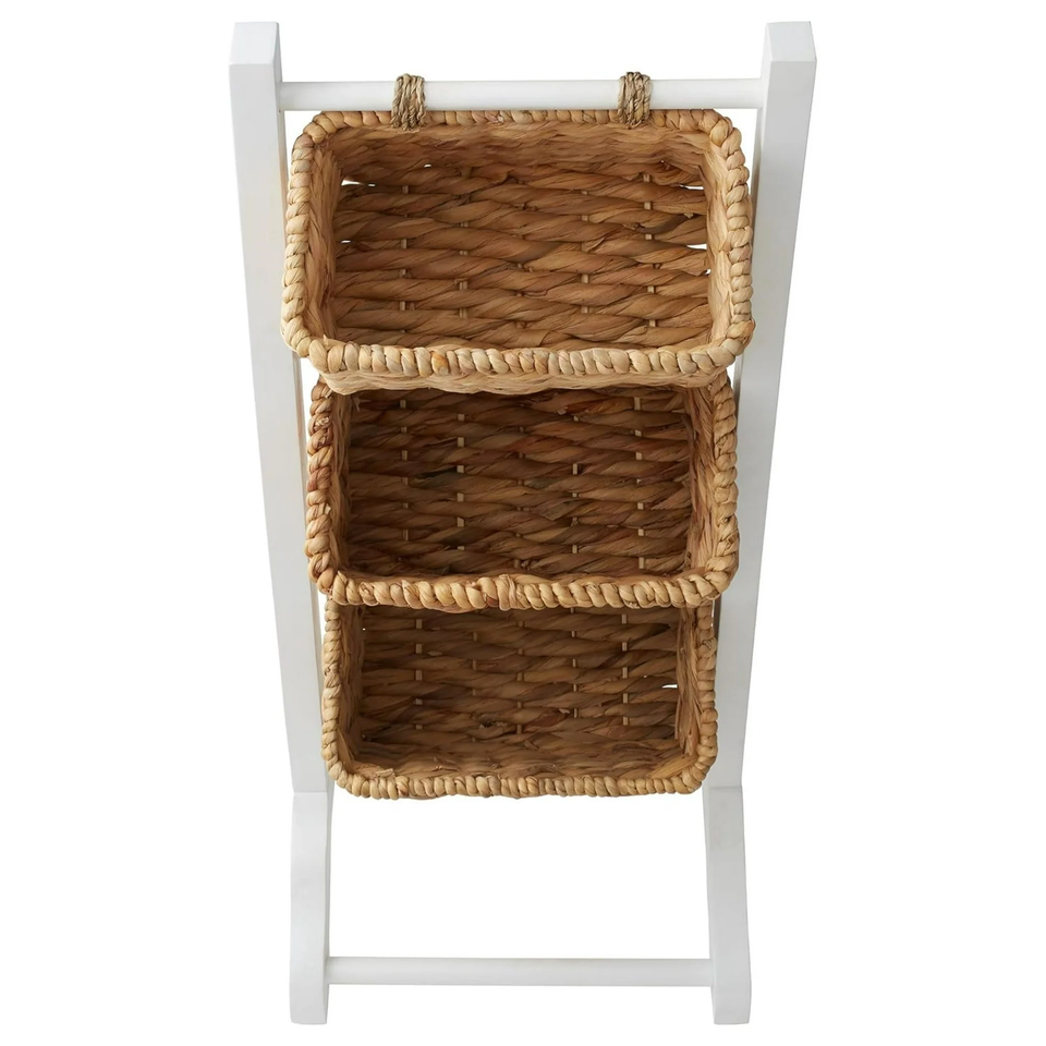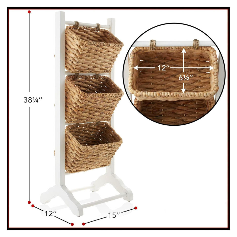 TienPhong Wholesale Handmade 3-Tier Floor Stand with Water Hyacinth Storage Baskets, White/Natural - Standing Organizer Rack