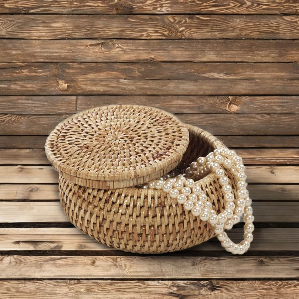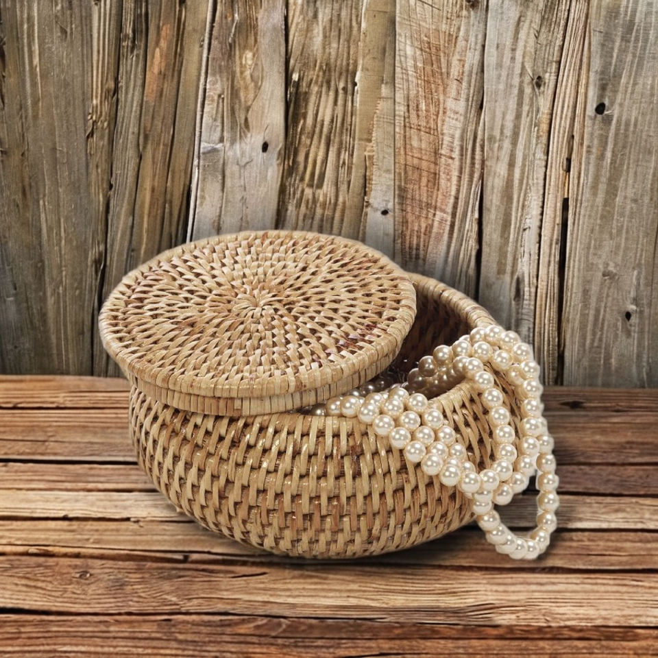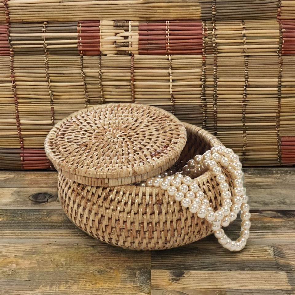 TienPhong Wholesale Handwoven Rattan Jewelry Pot with Lid - Small Storage Basket for Rings, Earrings & Trinkets
