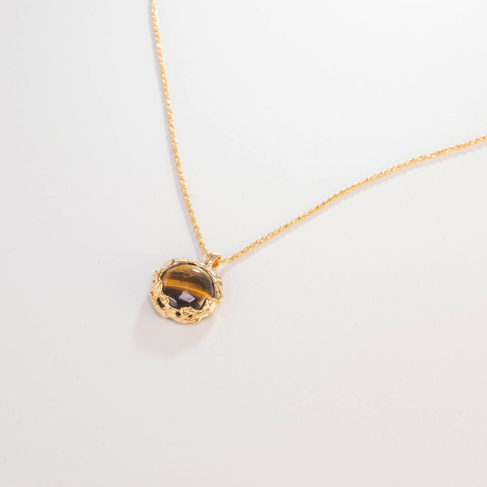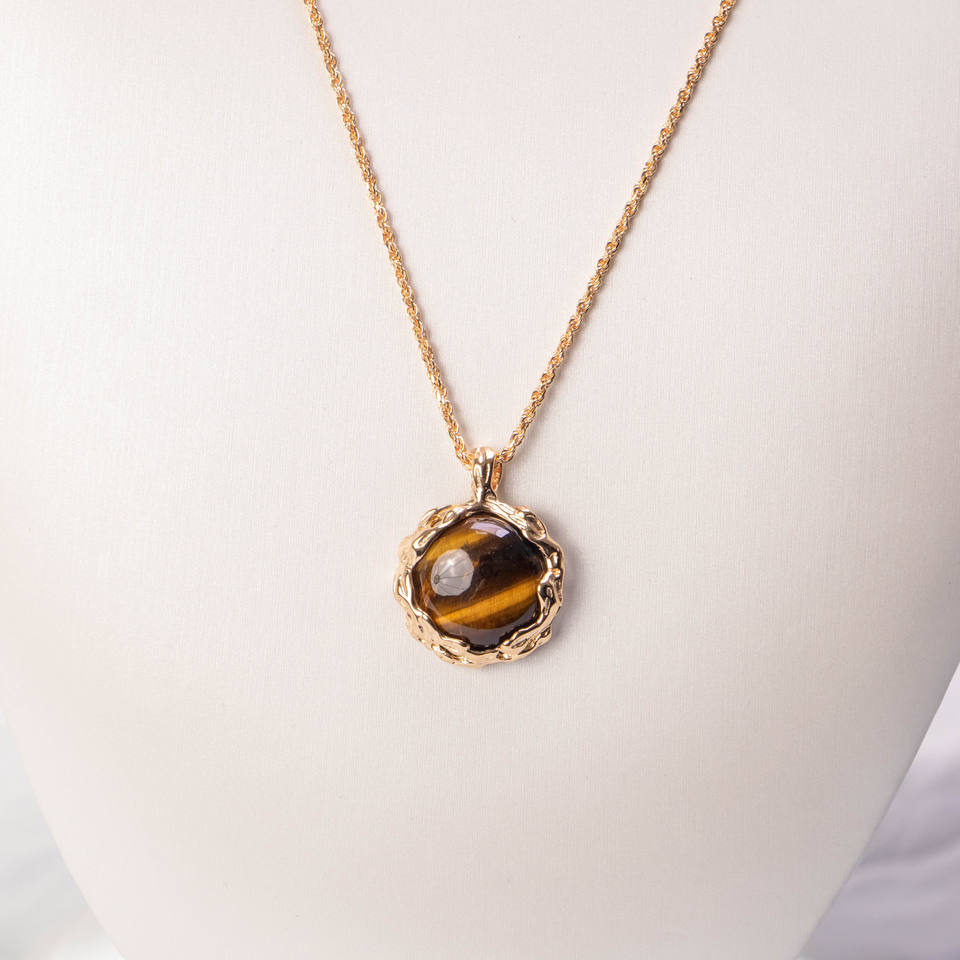 Tiger Eye Stone Pendant Necklace 18K Gold Plated Vintage Retro Style Round Gem Necklace for Women Fashion Jewelry Gift