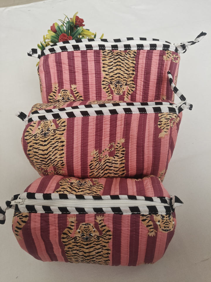 Tiger Red Stipel Block Printed Durable Cotton Zipper Makeup Case Indian Pouches Travel Cosmetic Practical