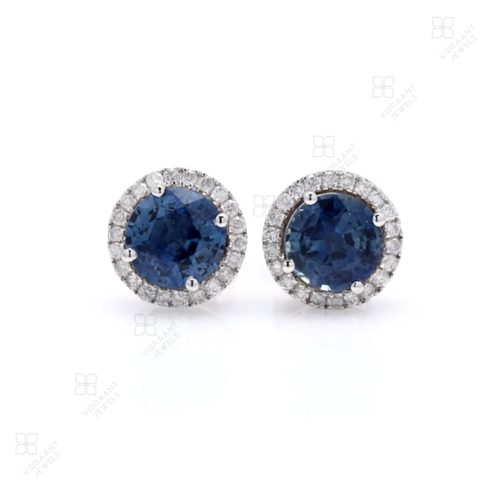 Timeless Round Real Blue Sapphire Stud Earrings With Diamond 14k 18k Solid Gold Minimalist Earrings Jewelry for Women Wholesale