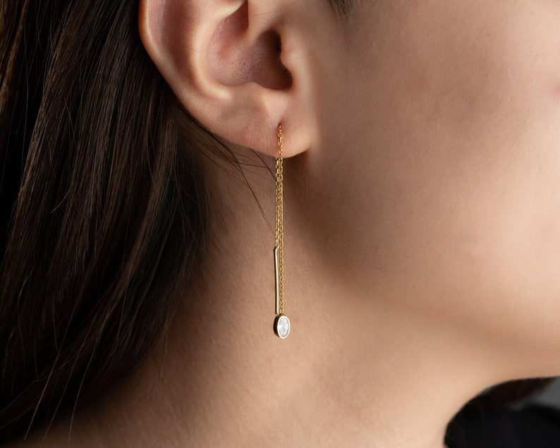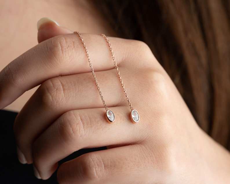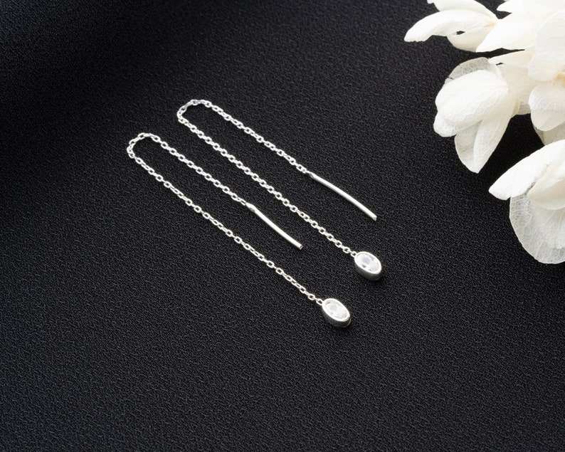 Tiny Oval Gemstone Dangle Chain Earrings Dainty Silver Threader Earrings With Crystal Minimalist 14K Gold Filled Earrings