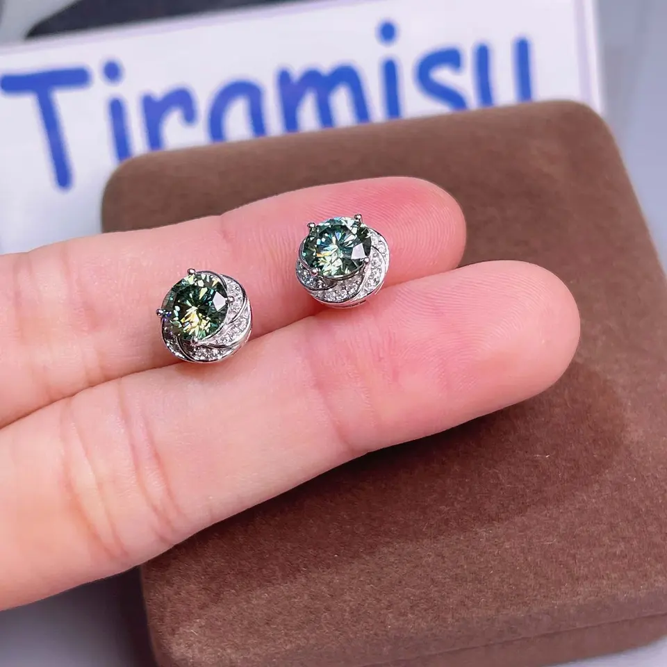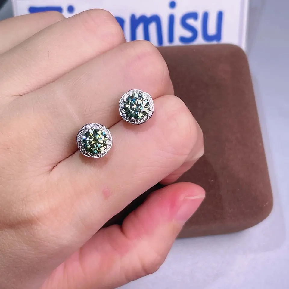 Tishya Diamond Women's 925 Silver 1ct Green Moissanite Floral Stud Earrings Gold Plated for Weddings Engagement Anniversary