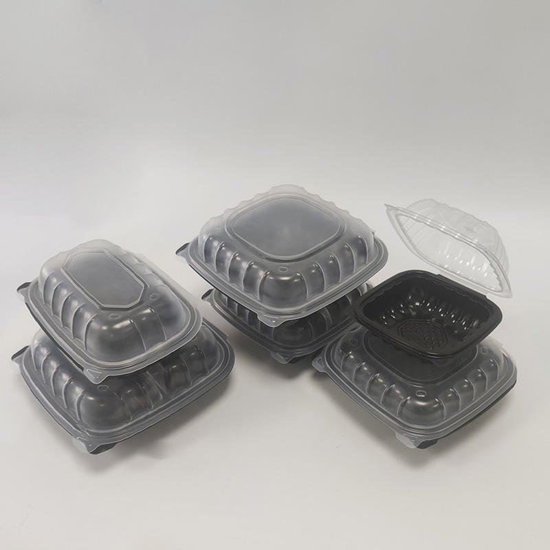 Tiya Disposable Black Base Clear Lid Food Grade PP Clamshell Containers 7.96x7.84x2.86 Inches Microwavable Stackable for