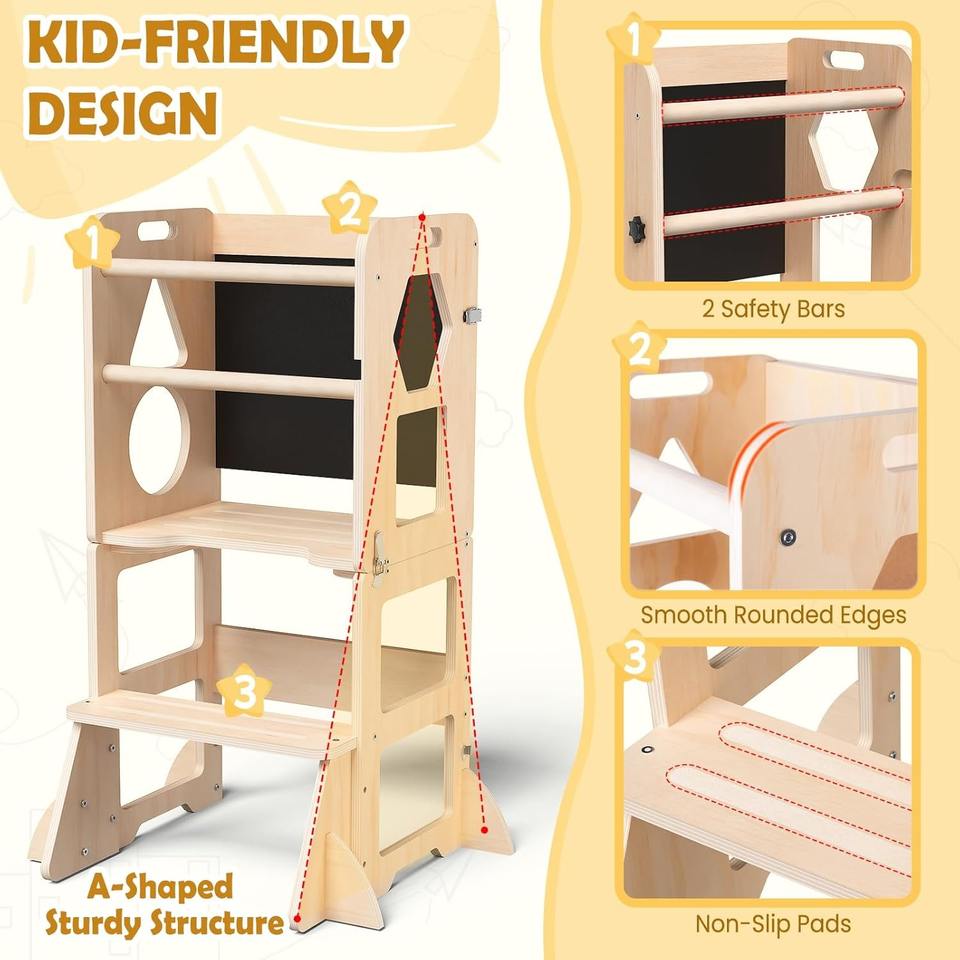 Toddler Kitchen Step Stool, Foldable Learning Standing Tower with Blackboard Stool for Ages 18 Months to 6 Years