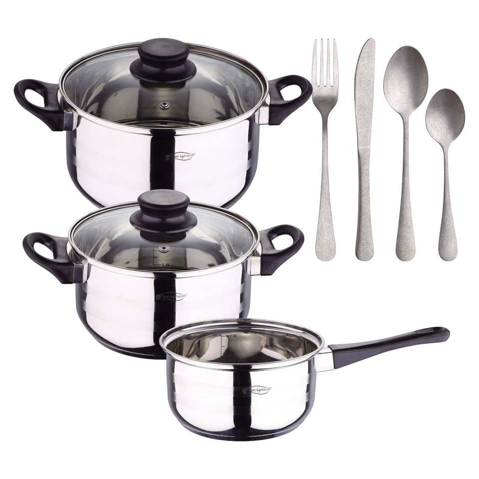 Toledo 5pc Cookware Set Suitable for Induction Hobs + NOIA San Ignacio 16-Piece Stainless Steel Cutlery Set