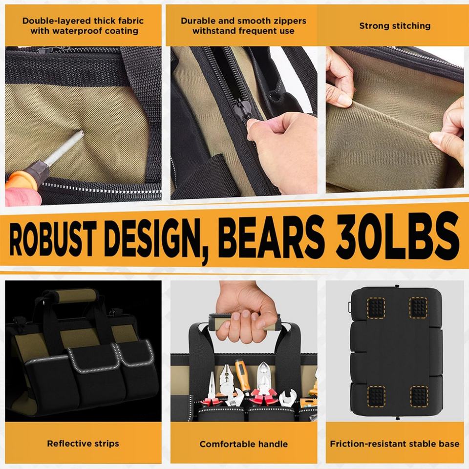 Tool Bag 15.5 Inch with 1 Pouch 17-Pocket Portable Tool Box Organizer Storage with Adjustable Strap Heavy Duty Tool Bags for Men