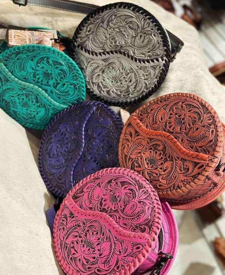 Wholesale Price on Most Popular Choice Tan Color Curved Western Carving Handbag Tooled Leather Canteen Bag