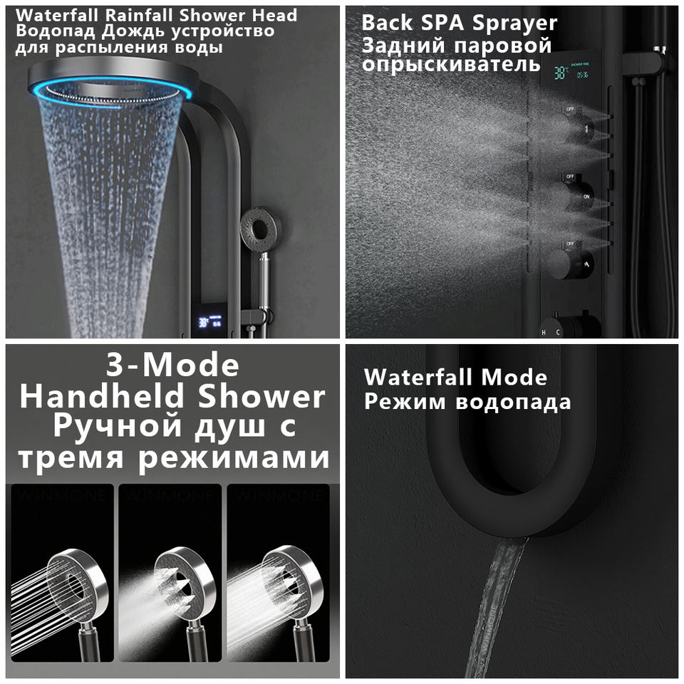 Top 1 High End Back Jet Spa Massage Wall Mounted Shower System Grey LED Display Mixer Smart Bathroom Waterfall Rain Shower Panel