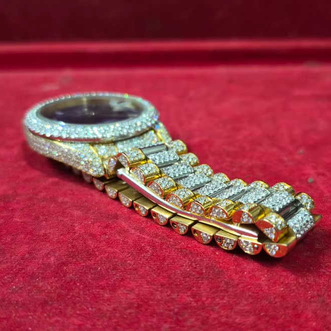 Top Designer 41mm Full Diamond Moissanite Yellow Gold Stainless Steel Lightweight Quartz Watch Business Style Leather Hip Hop