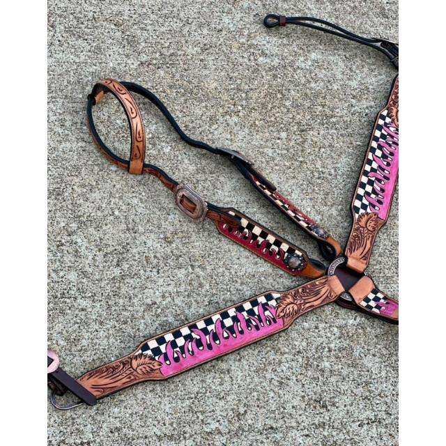 Top Grade Soft Finish Leather Western Tack Set with Tooled Pattern Headstall Padded Chest Collar & Buckle Parts for Horse Racing