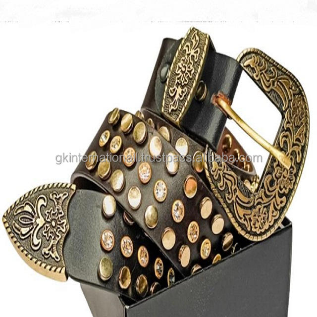 Top Grain Golden Stud Crystals Men's Genuine Leather Casual Belt Customized Handmade Fashion Belt with 3 Piece Floral Buckle