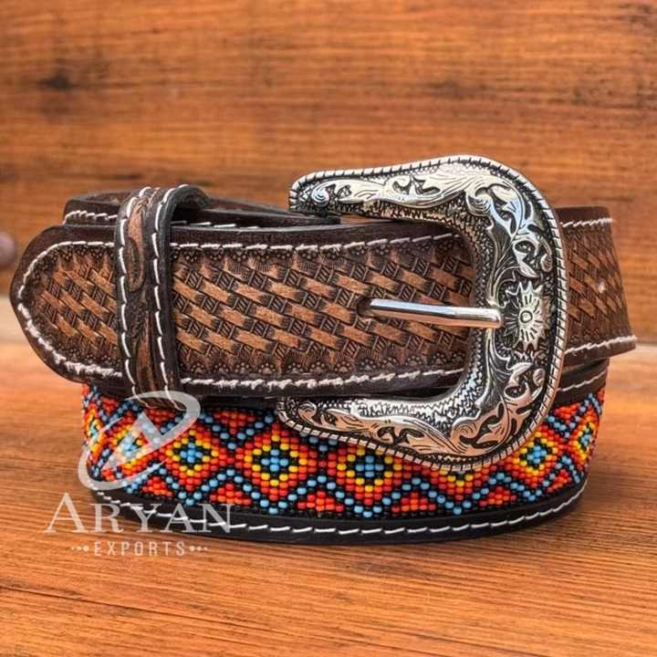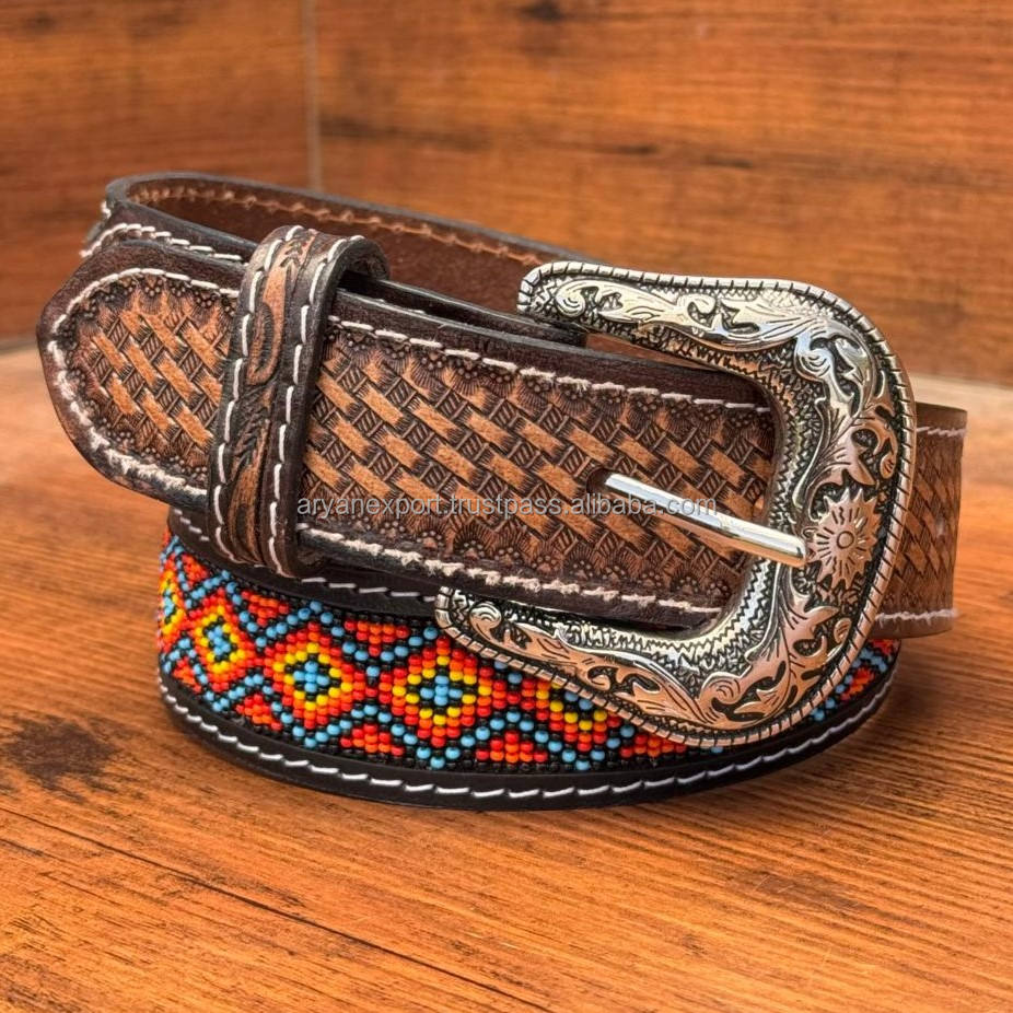 Top Manufacturer Supplier Western Cow Leather Beaded Belt for Men & Women With Hand Tooled Design & Durable Adjustable Buckle