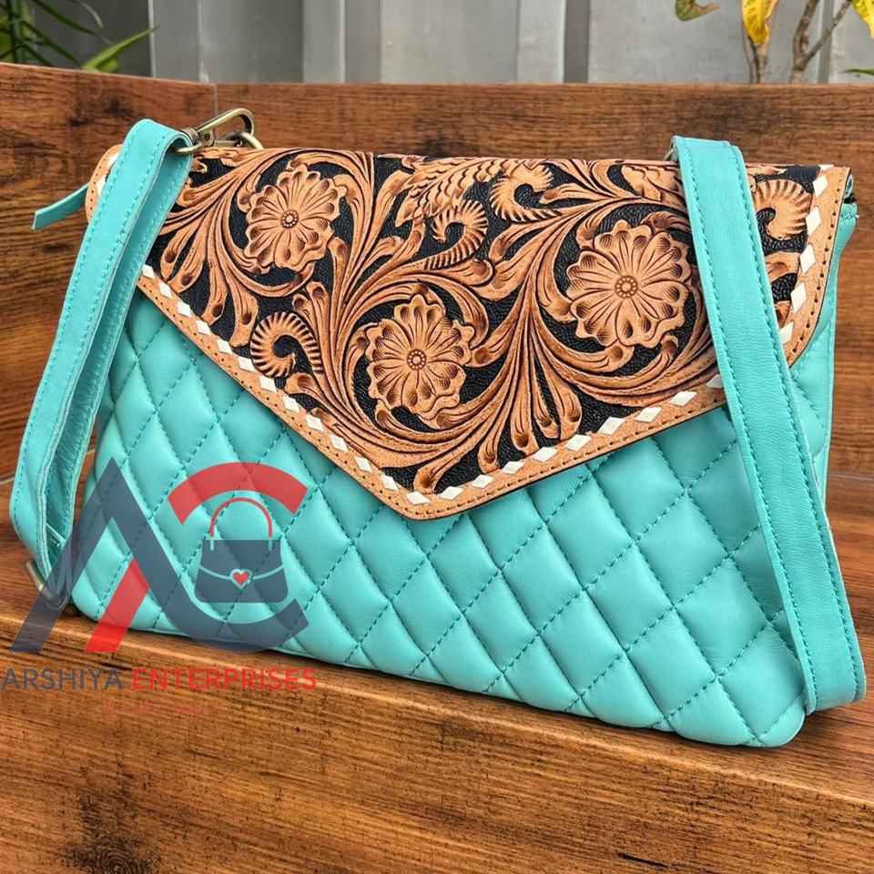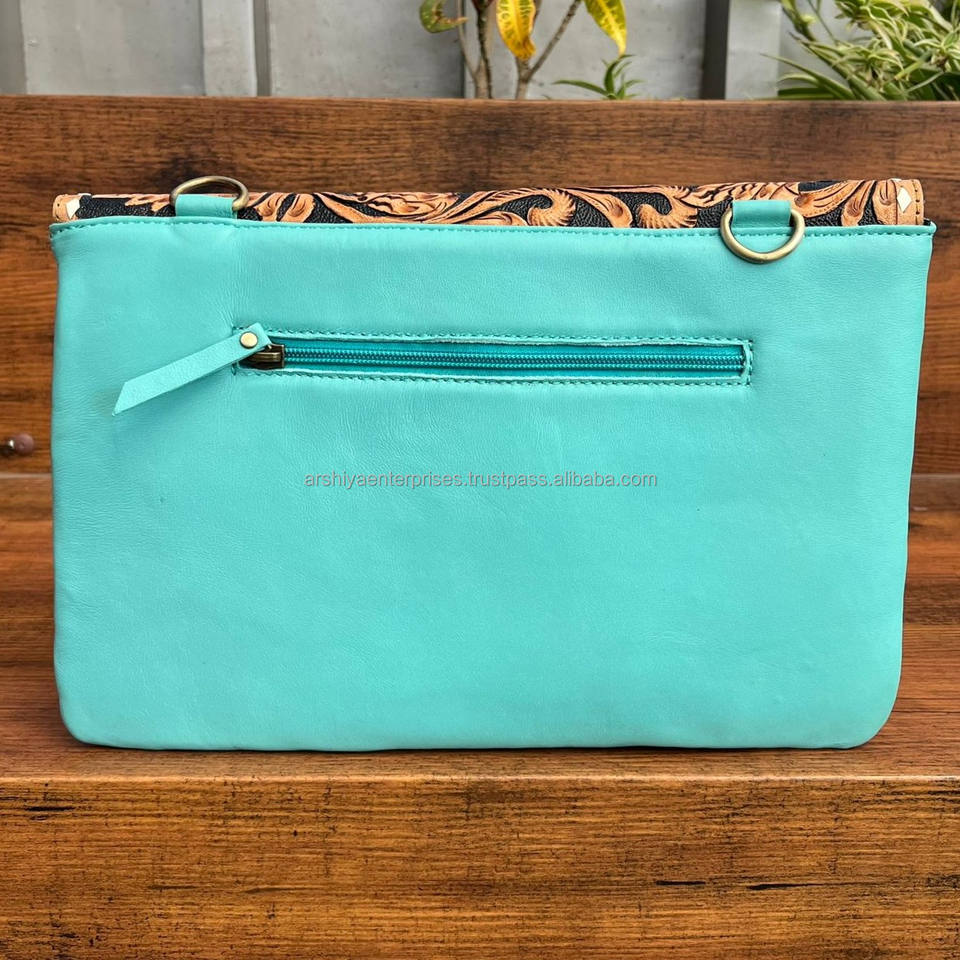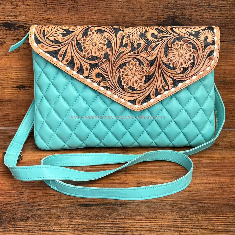 Top Products Hand Tooled Diamond Lattice Envelope Crossbody Bags for Women Genuine Leather Clutch Handbags Cowhide Floral Purse