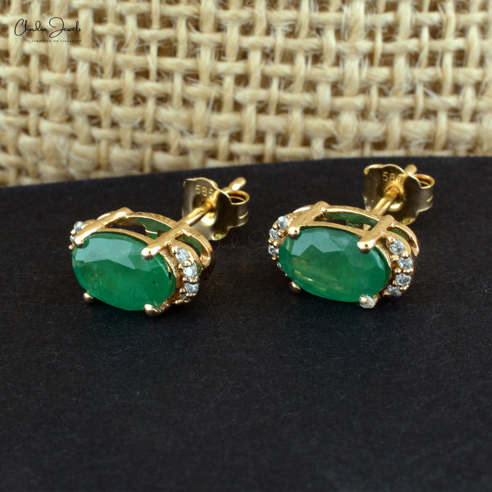 Top Quality 14k Yellow Gold Prong Set Gemstone Studs Genuine 7x5mm Emerald & Small Diamond Wedding Earrings Direct Factory Price