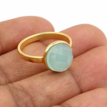 Natural Aqua Chalcedony Round Shape Sterling Silver Gold Plated Ring