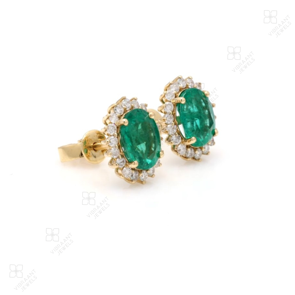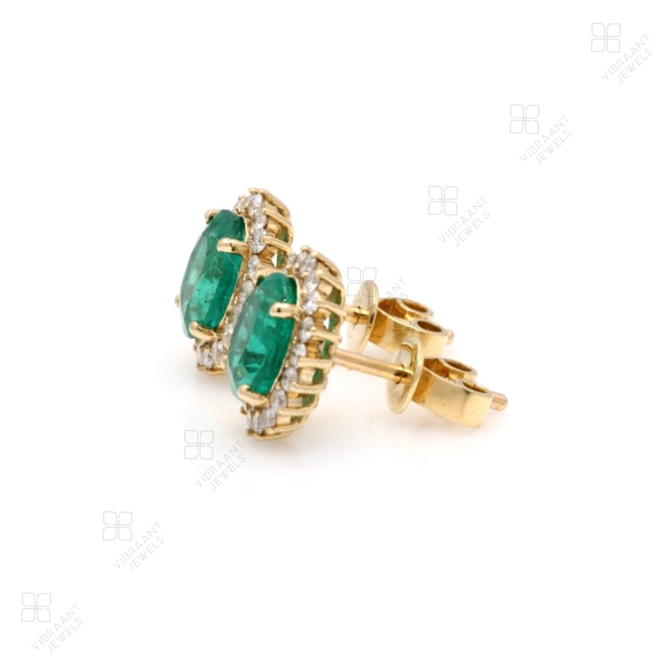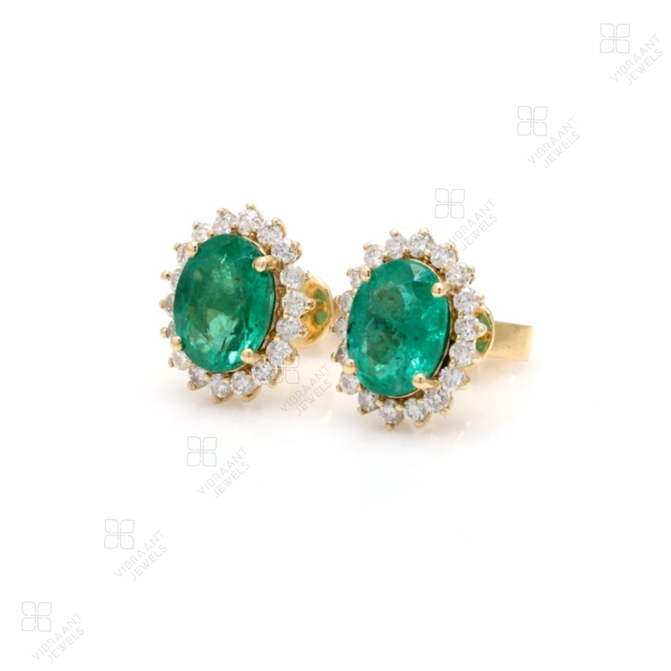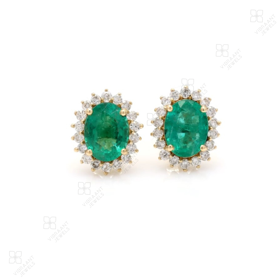 Top Quality 8x6 MM Zambian Emerald 14K Yellow Gold Studs Halo Earrings with Diamonds Oval Cut Gemstone Cluster Earrings in Bulk