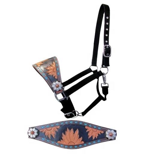 Top Quality Adjustable Black Nylon Rope Halter With Hand Painted Sunflower Design & Buck Stitch Work Wholesale Manufacturer