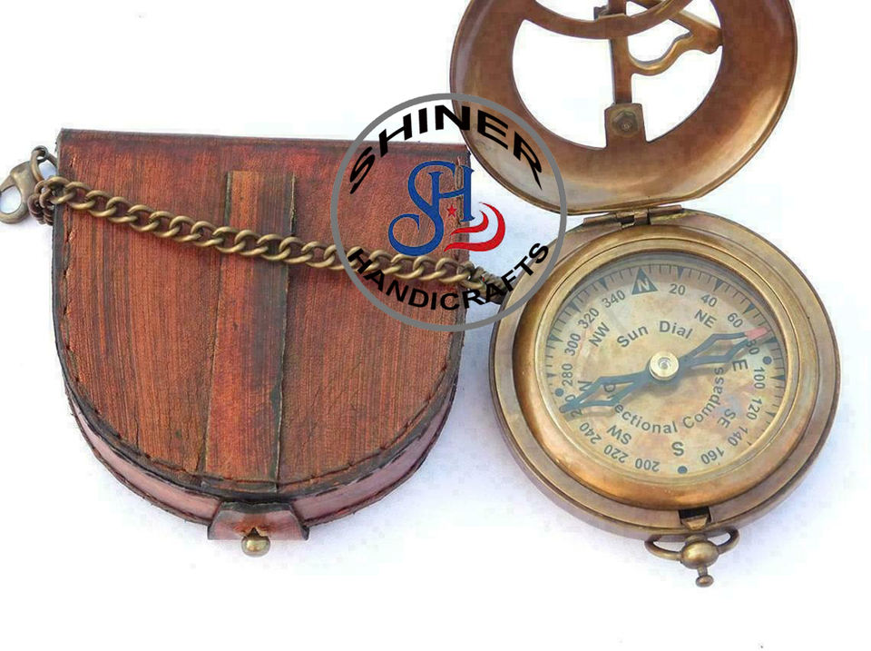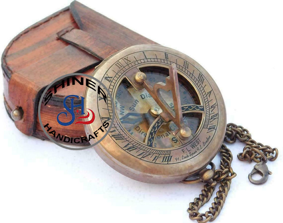 Top Quality Brass 2" Nautical Sundial Compass With Leather Box Collectible Marine Sundial Antique Compass HALLOWEEN Item