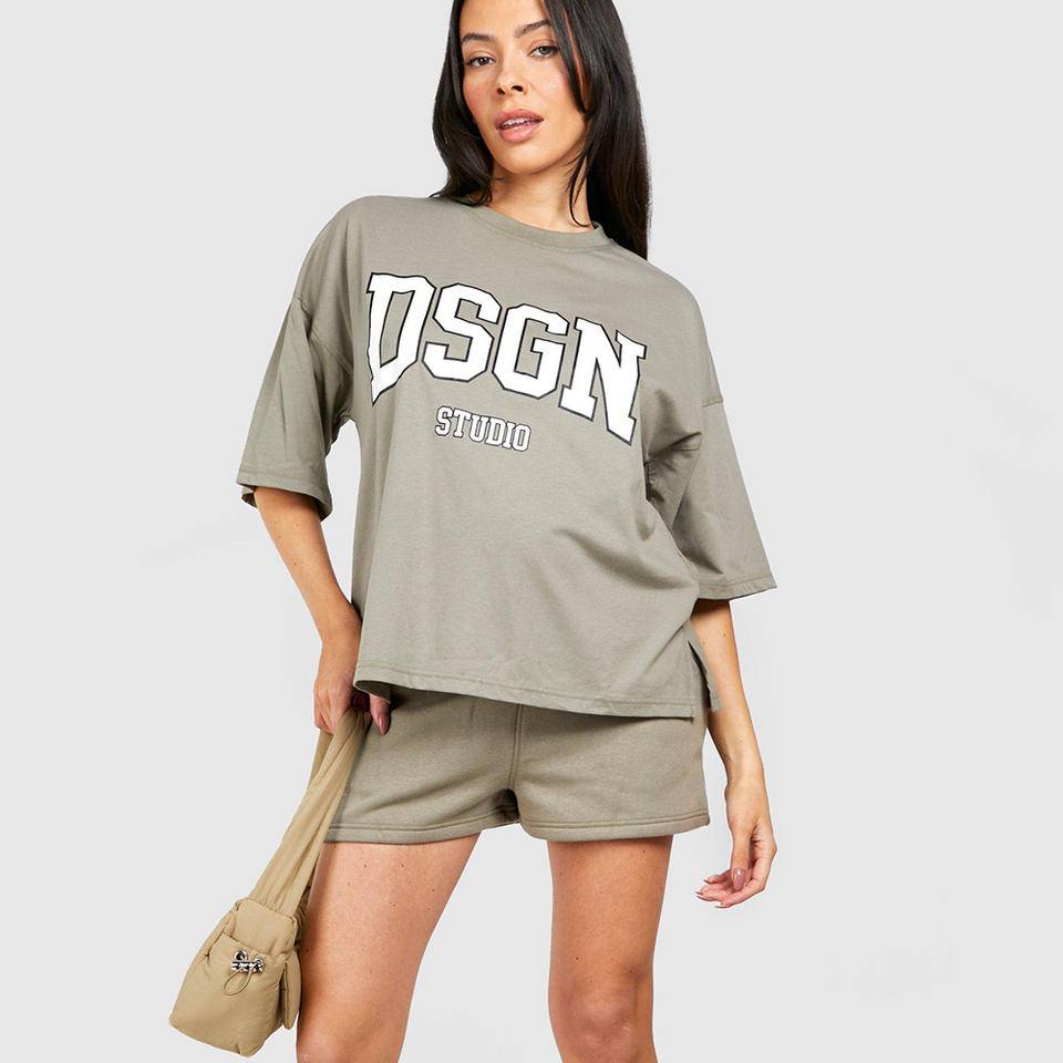 Top Quality Custom Light Khaki 2 Piece Women's Maternity Dsgn Studio T-Shirt Tracksuit Set Women's 2 Piece Sweat Suit Shorts Set