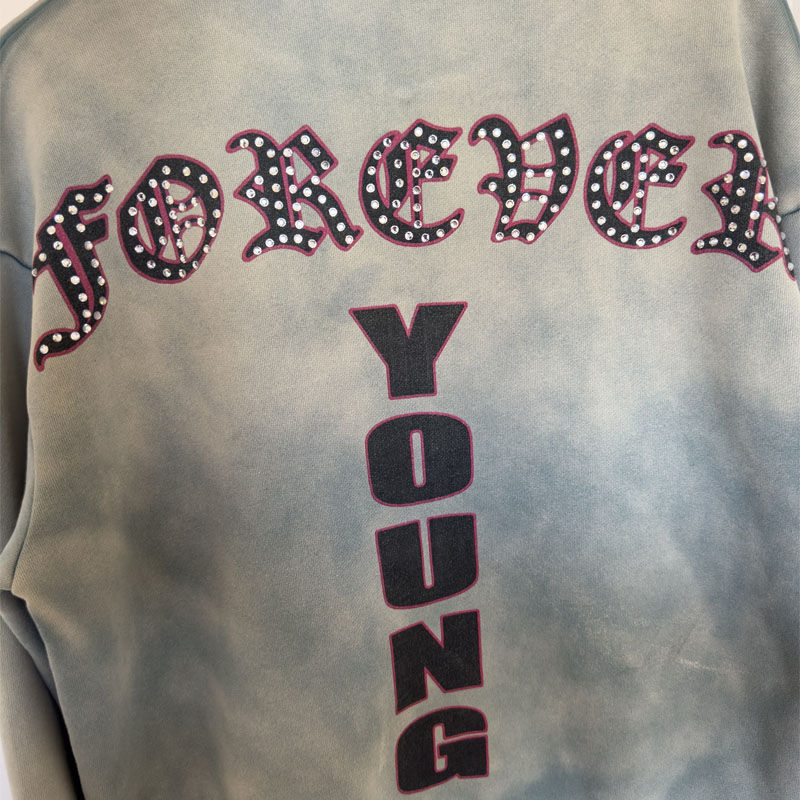 Top Quality Custom Printed Frayed Hooded Zip-Up Hoodie for Men Sun Faded Acid Wash Streetwear 100% Cotton Rhinestone Hoodie