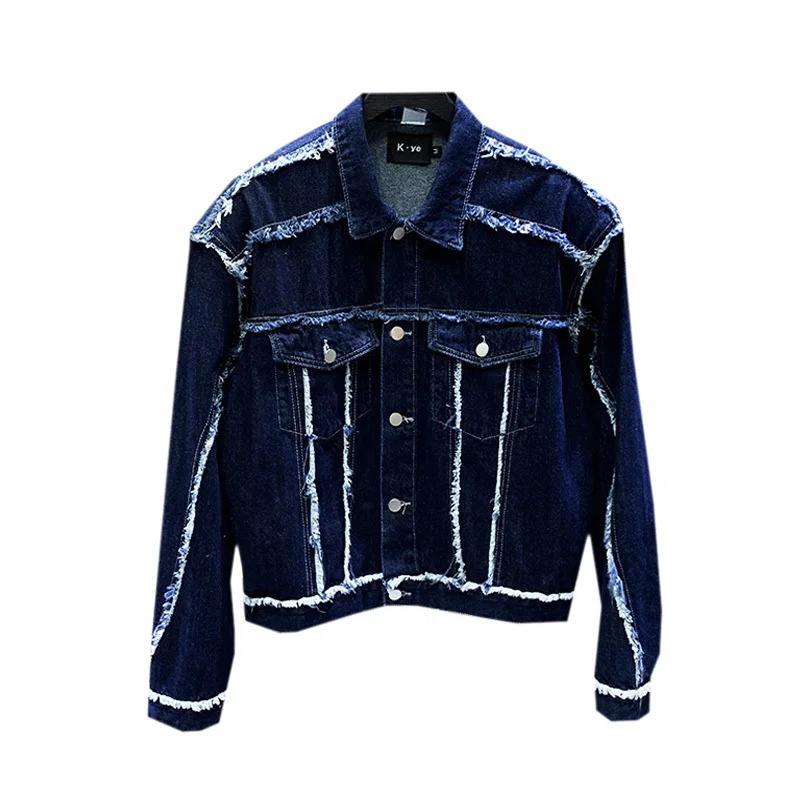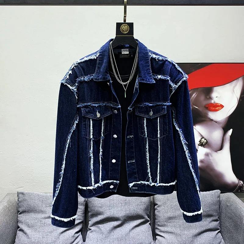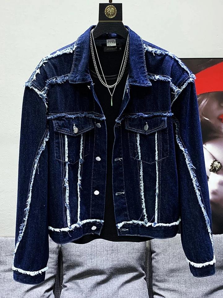 Top Quality Elegant Design Fur Edge Shoulder Pad Long Sleeve Denim Jacket Splicing Men's Spring Casual Short Coat Stylish