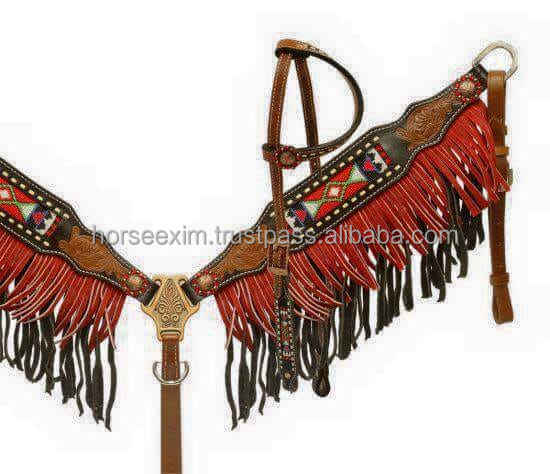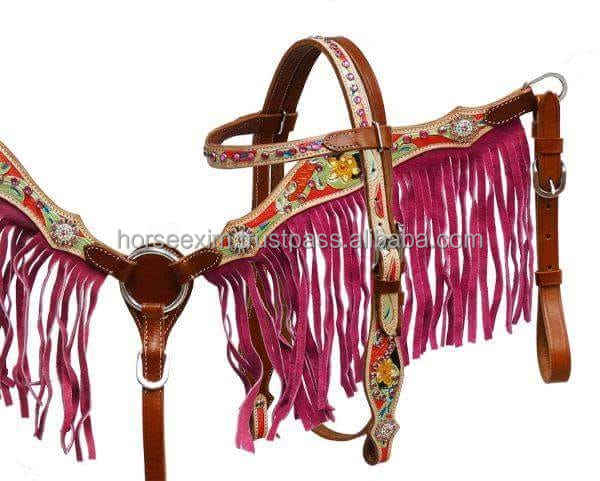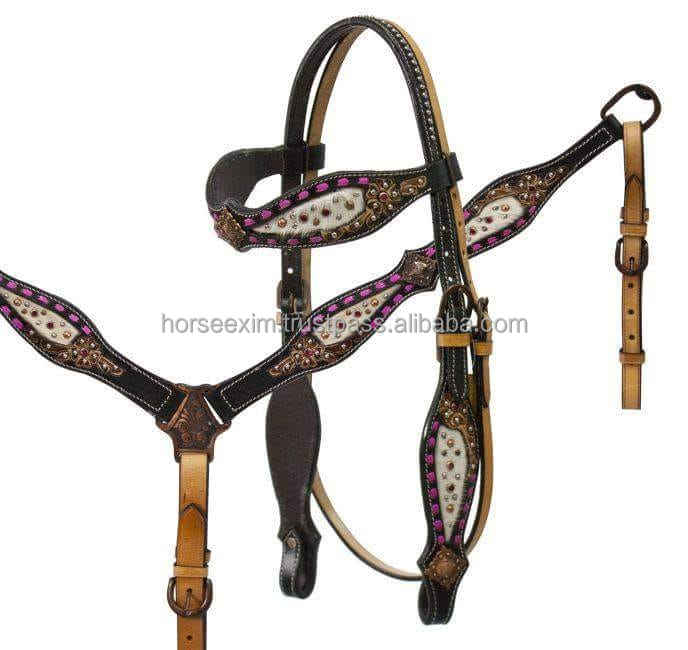 Top Quality Genuine Leather Green Color Rivet Decorative with Fancy Crystal Conchos Horse Headstall Breastplate in Best Price