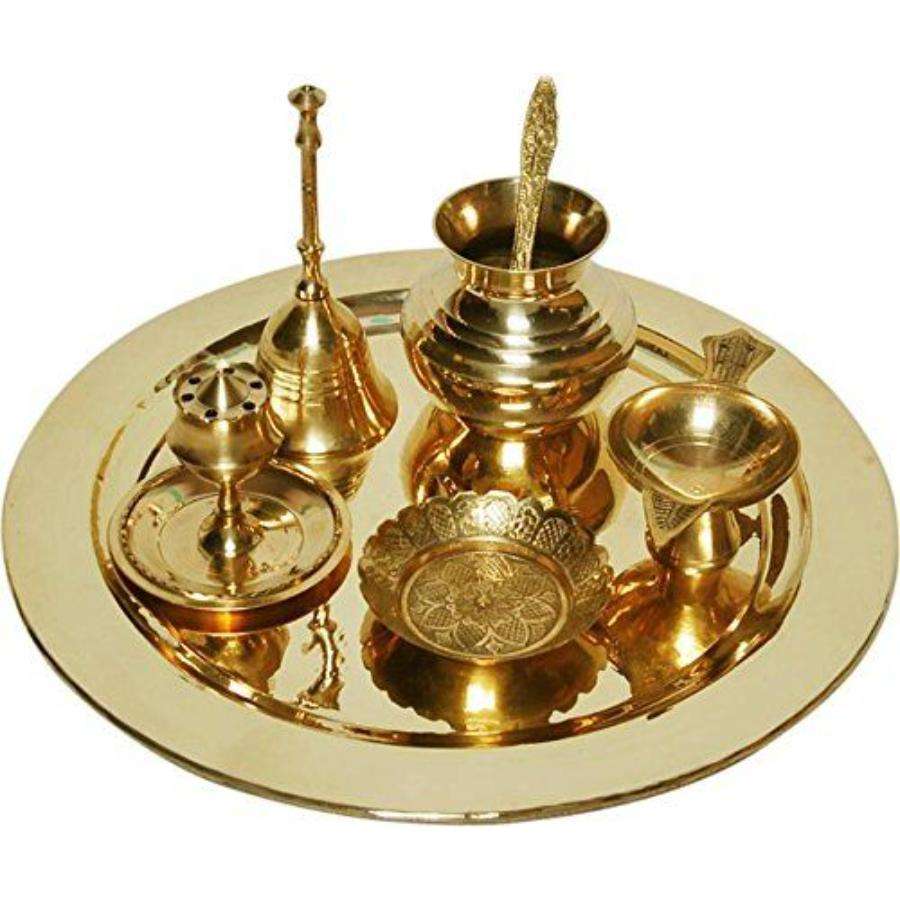 Top Quality Golden Pooja Thali Hindus Gifts Sets Luxury Round Thali And Tray Customized Gifts Sets Decorative Diwali Pooja Set