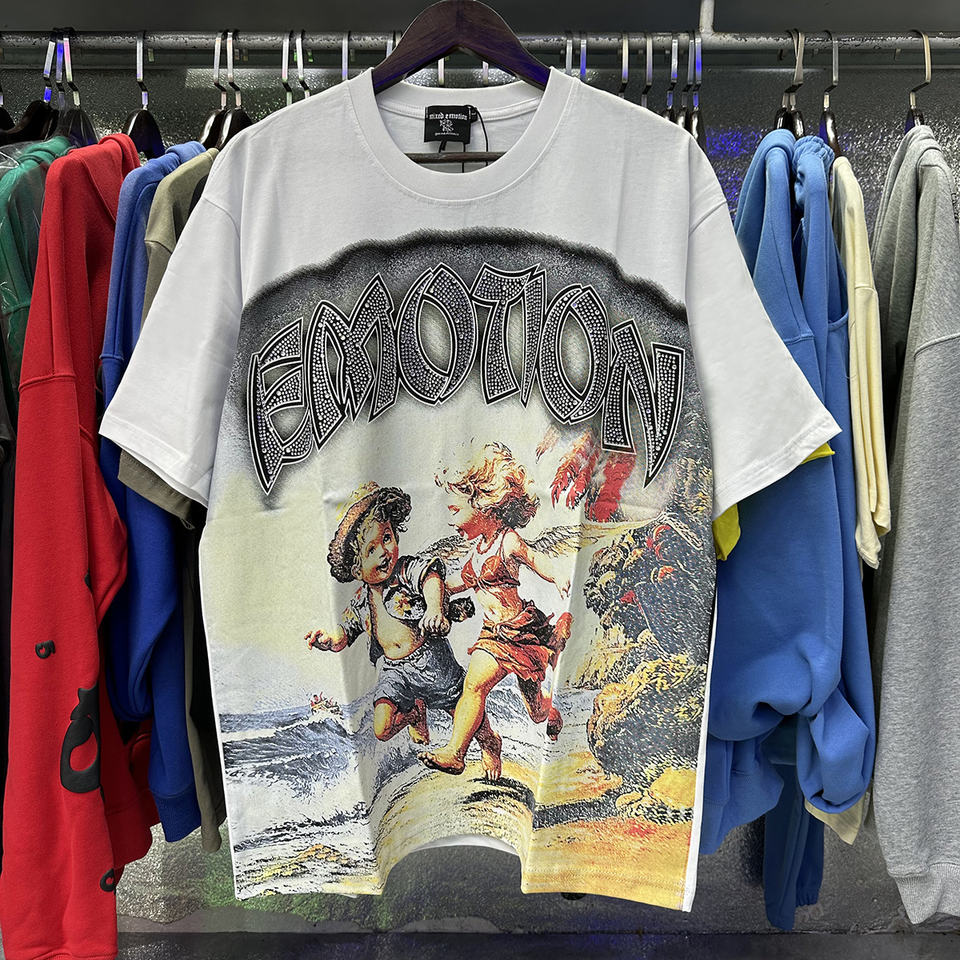 Top Quality Heavyweight MIXED EMOTIONS Retro Print Letter High Street Casual Hip-Hop 100% Cotton Short Sleeve T-Shirt for Men