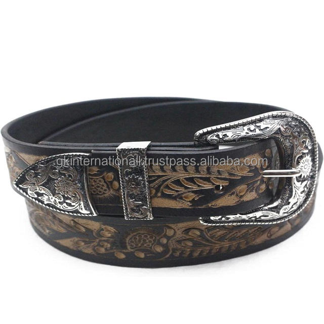 Top Quality Leaf Embossed Men's Western Leather Tooling Belt with 3 Piece Floral Engraved Antique Western Style Floral Buckle