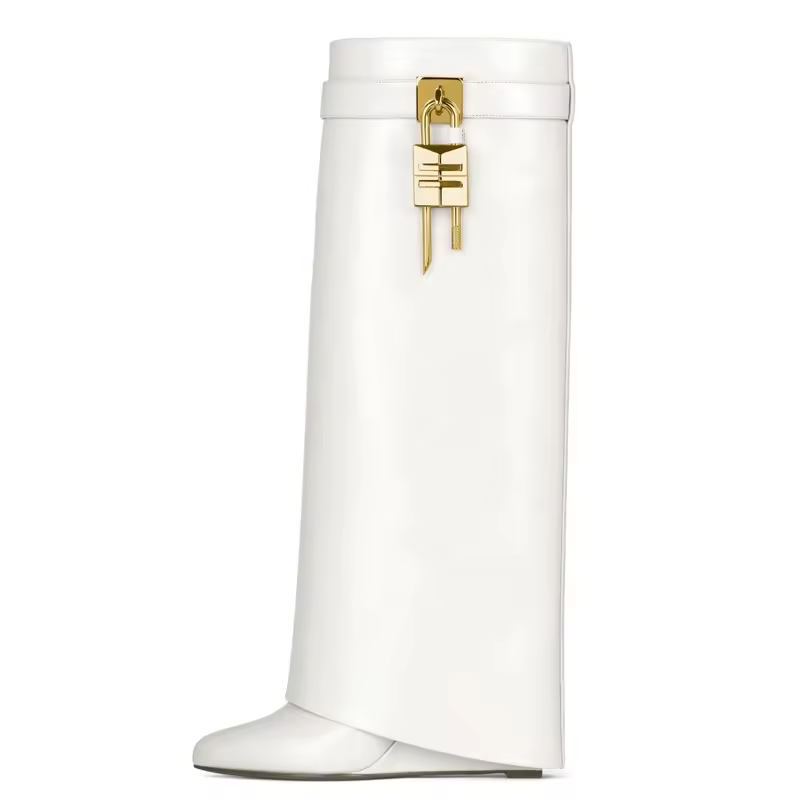 Top Quality Leather Fold Over Long Boots Soft Overlay Slip-on Wedge Heel Shoes Women's Knee High Boots Metal Shark Lock Size 43