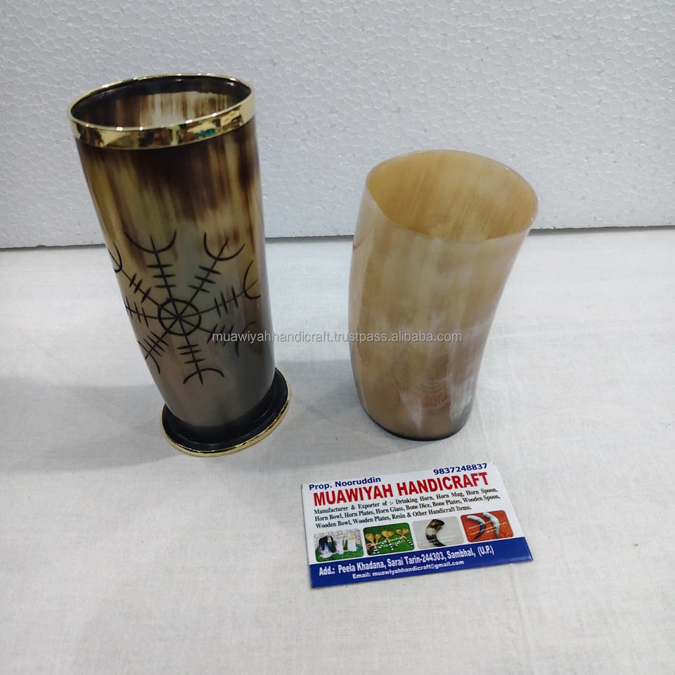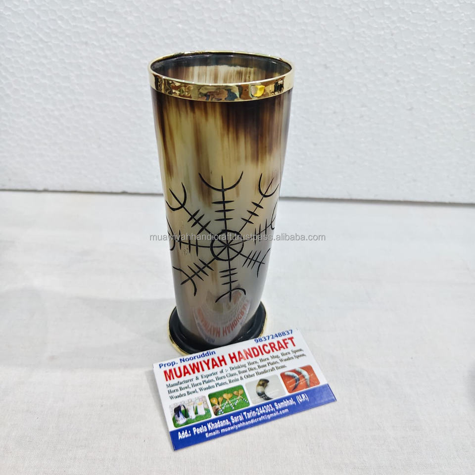 Top Quality Ox Horn Glass With Engraved Carved and Brass Ring Of Double Side Drinking Horn Glass Ox Horn Viking for Parties