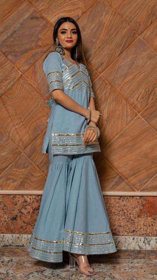 Products Name:Powder Blue Pure Cotton Sharara Set with Organza Dupatta