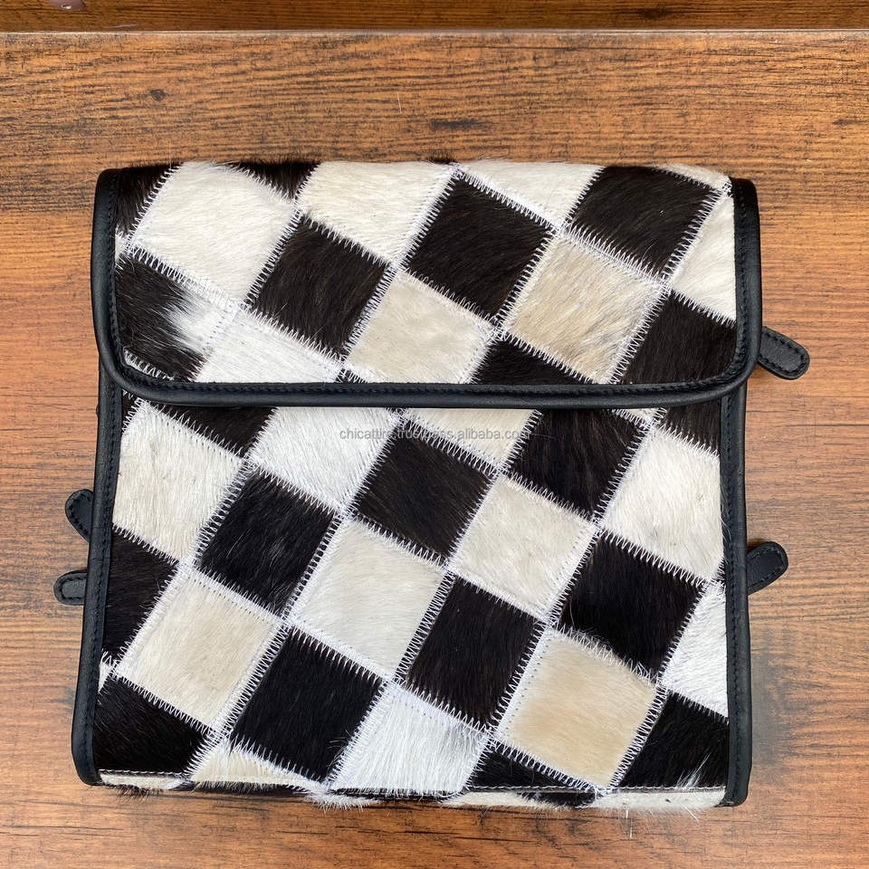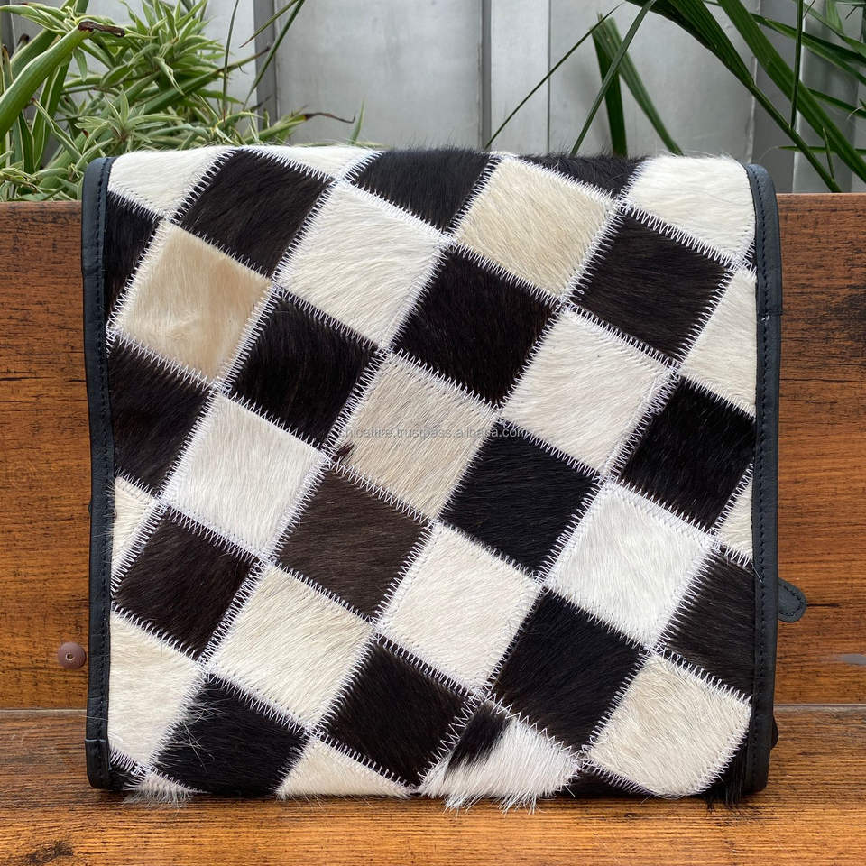 Top Quality Premium Black & White Checkered Cowhide Fur Leather Foldable Travel Jewelry Organizer Luxury Design Storage Case Bag