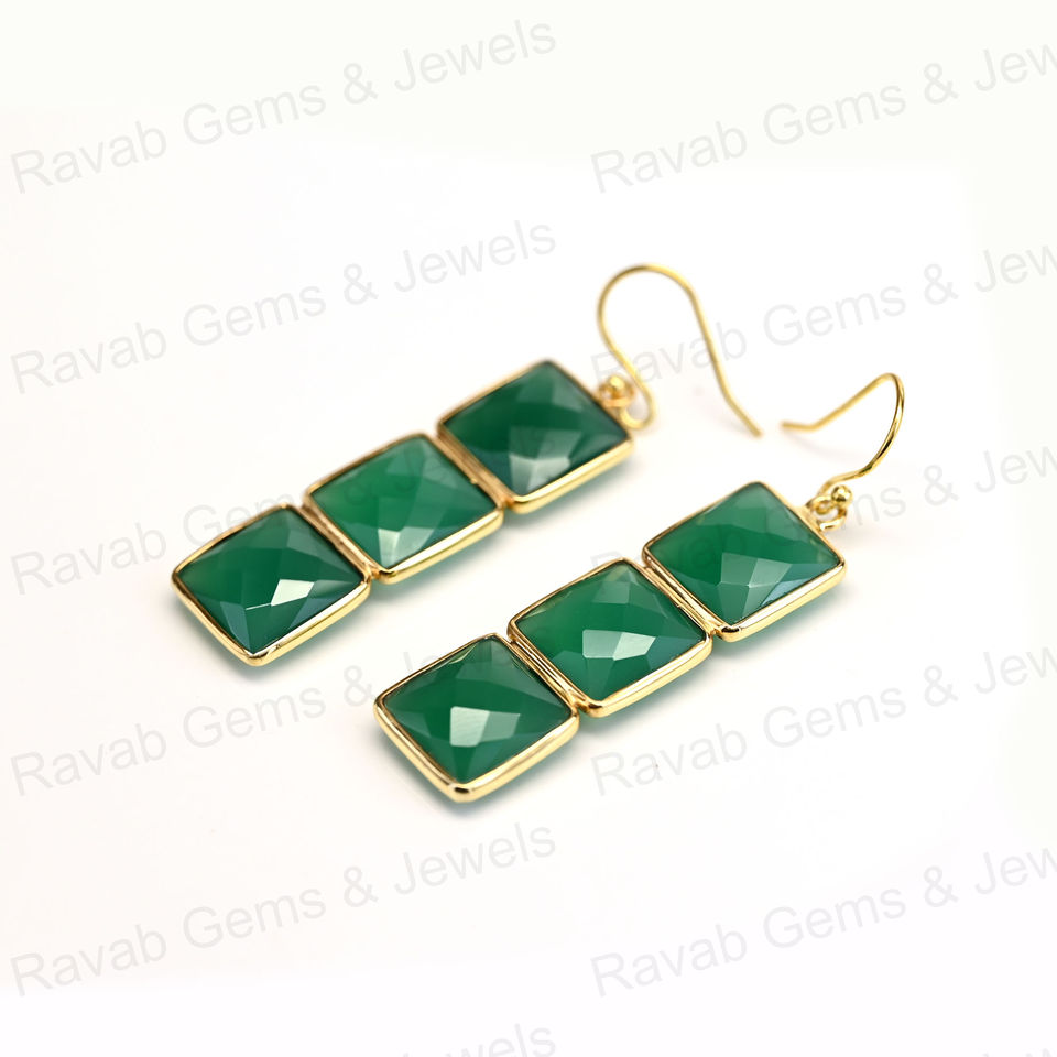 Top Quality Solid 925 Sterling Silver 10mm Natural Green Onyx Square Checker Cut 18k Gold Plated Dangle Drop Earring for Women
