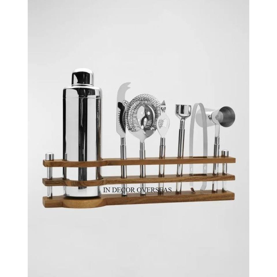 Top Quality Stainless Steel Silver Shiny Polished Cocktail Shaker Bottle Opener Tong And Other Bar Items Set With Wooden Stand