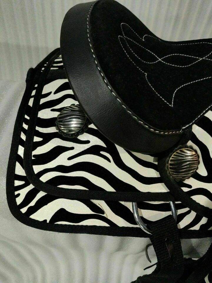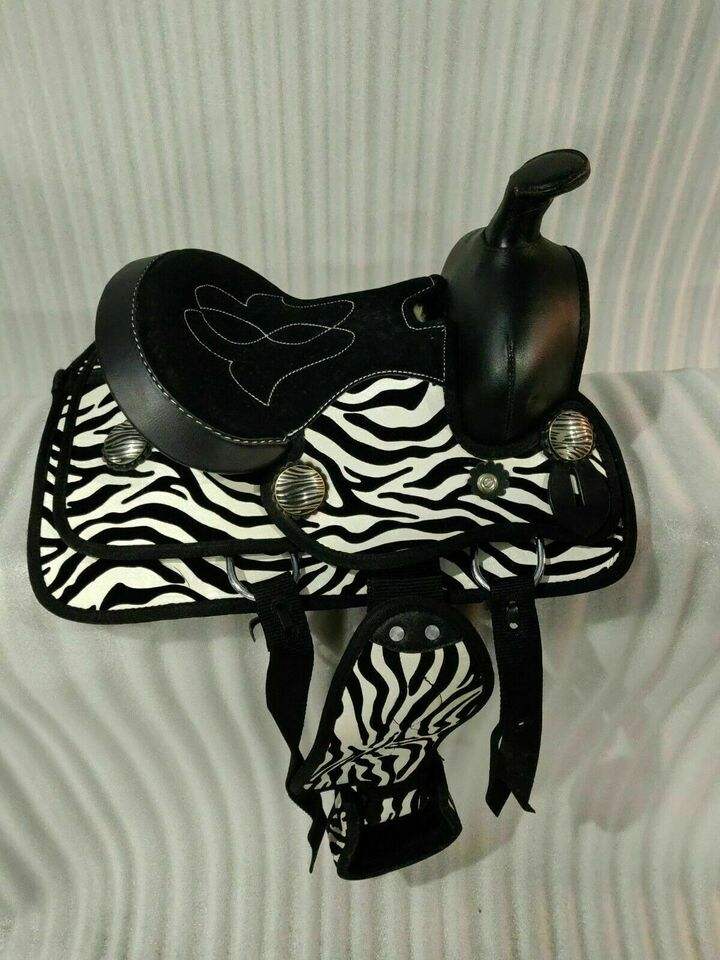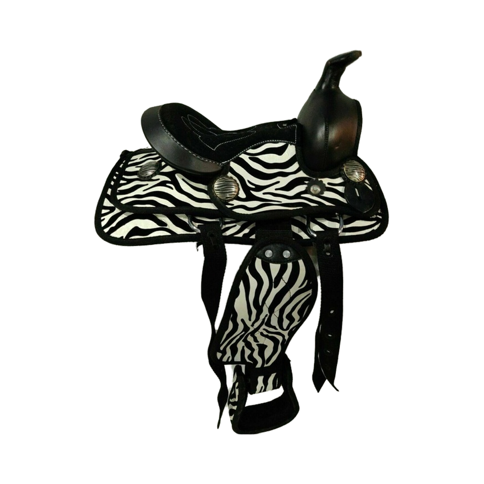 Top-Quality Synthetic Leather Western Trail Saddle with Zebra Print and Silver Conchos Durable Stylish & Great Value for Horses