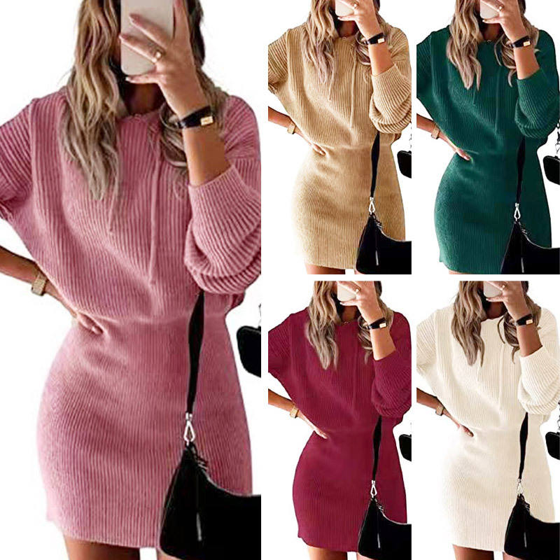 Top Quality Women's Winter Rib Knit Pullover Fashion Dresses Long Sleeve Hooded Bodycon Sweater Dress Women's Clothing